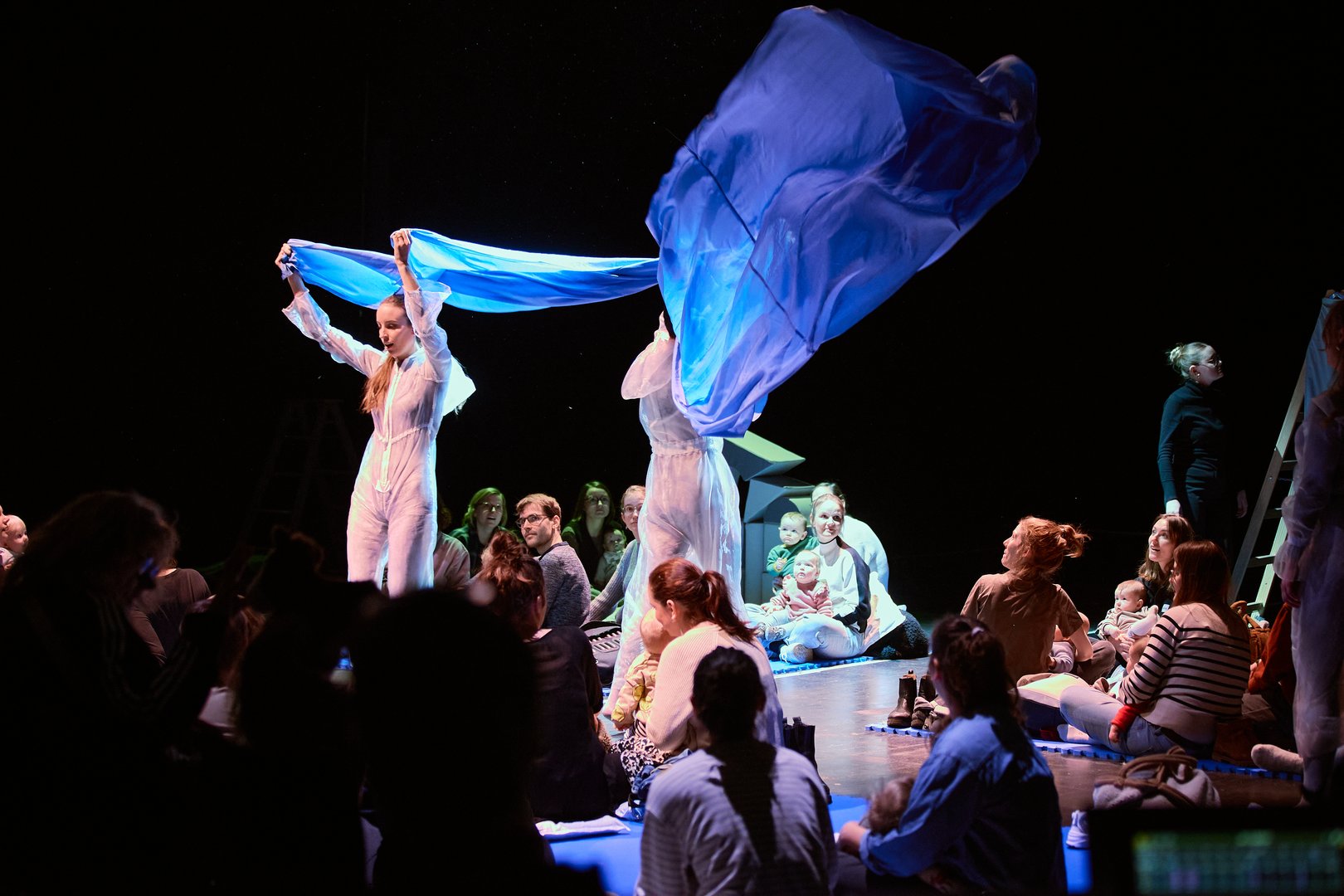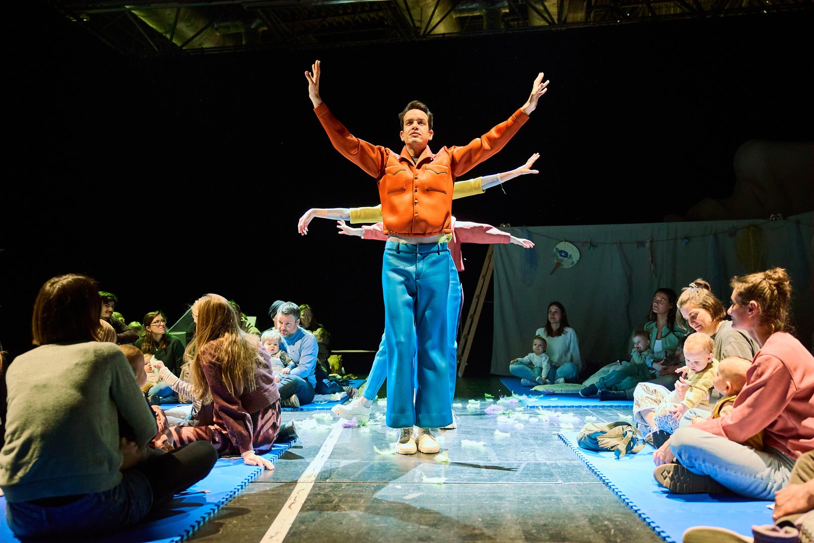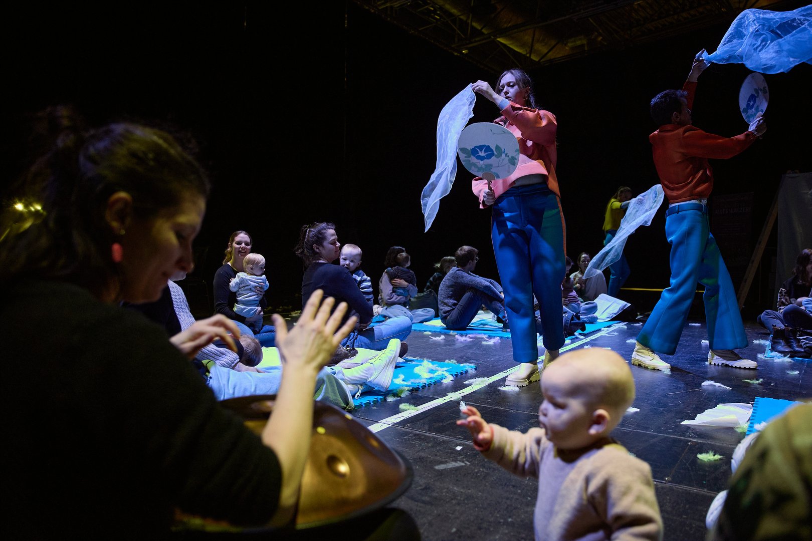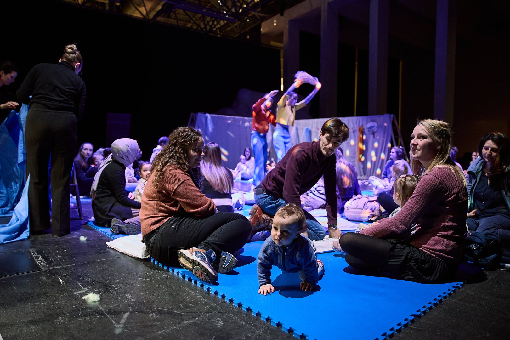 Auf unseren Sitzmatten können sich Babys und Kleinkinder mit Eltern, Großeltern und Geschwistern in die Kissen kuscheln und Sänger*innen sowie das Orchester aus nächster Nähe beobachten.
