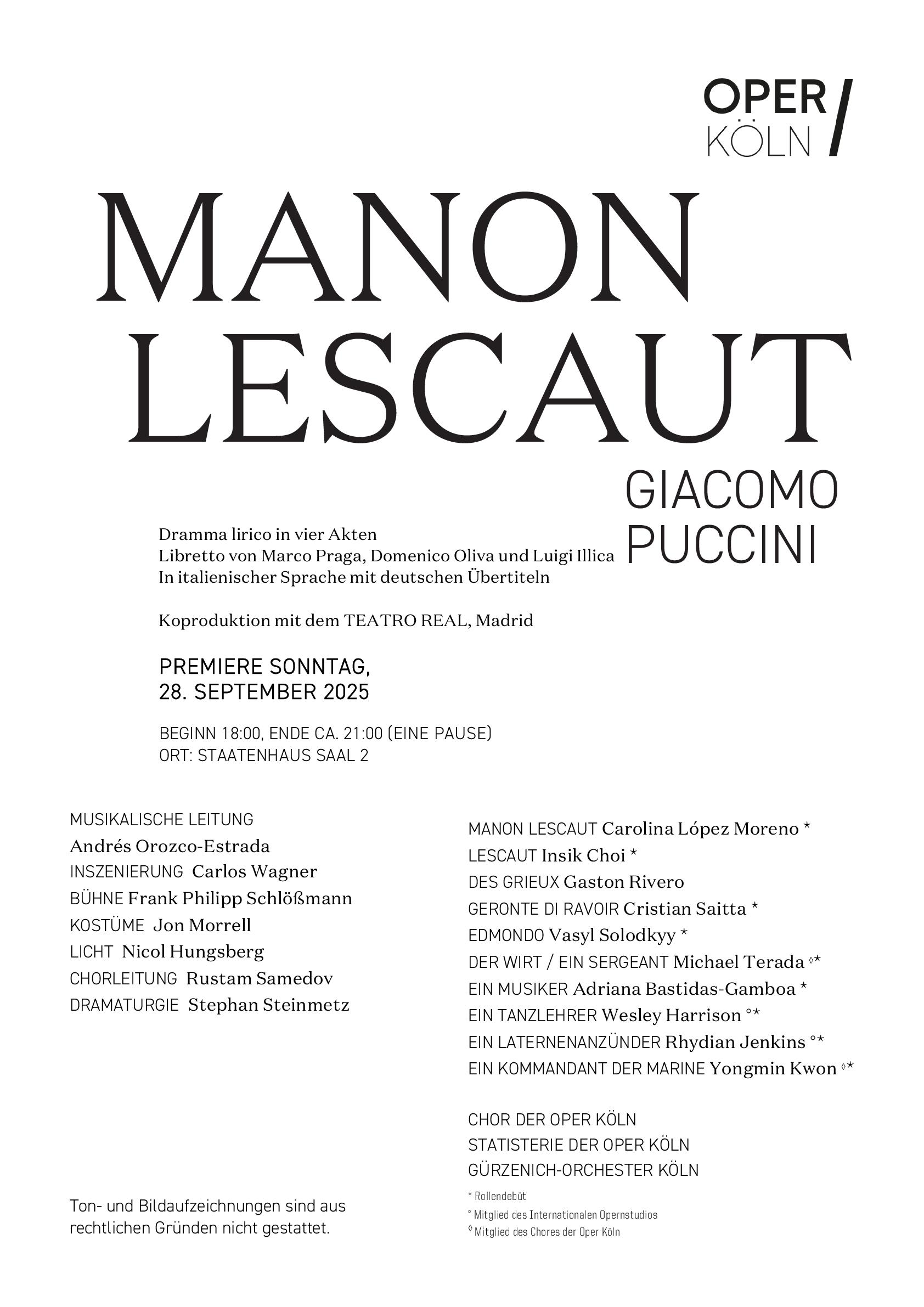 Musikalische Leitung Andrés Orozco-Estrada / Arne Willimczik / Inszenierung Carlos Wagner / Bühne Frank Philipp Schlößmann / Kostüme Jon Morrell / Licht Nicol Hungsberg / Chorleitung Rustam Samedov / Dramaturgie Stephan Steinmetz / Statisterie Statisterie der Oper Köln