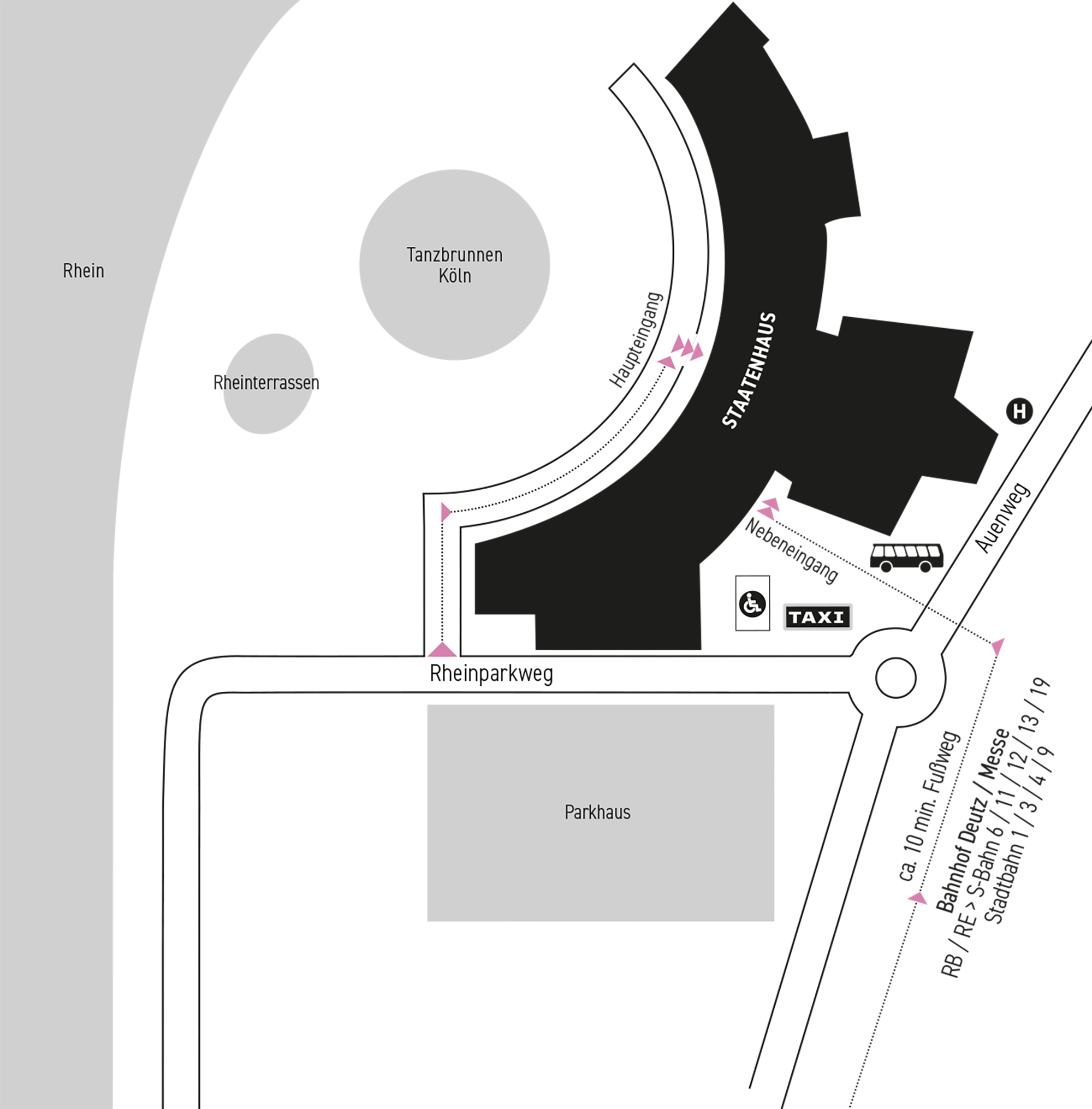 The railway station ‘Köln Messe / Deutz’ is only a short walk away from the StaatenHaus. Please follow the signs in the station building. Your admission ticket is also valid as a ticket for travelling to and from the Rhein-Sieg public transport network, 4 hours before the start of the event until closing time (3 a.m. on the following day). Please note the VRS conditions of carriage. Different conditions of carriage may apply when purchasing tickets online. In addition, the free opera bus runs from 60 minutes before and up to 30 minutes after the performance between the stops ‘Bahnhof Deutz / Messe’ (Ottoplatz, bus platform C), ‘Bahnhof Deutz / Messeplatz’ (Messeplatz, bus platform D&E) and ‘Oper Köln im StaatenHaus’.